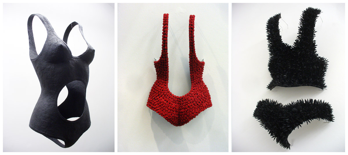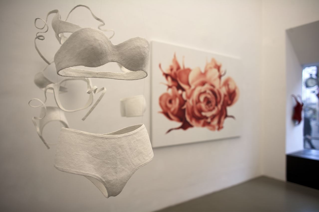 Andere Objekte hingegen erinnert an einen leeren Schildkrötenpanzer. Die sinnlich weiblichen Formen der Raum- und Wandinstallationen regen die Fantasie an und lassen Rückschlüsse an den ehemaligen Besitzer dieser Wäsche zu.