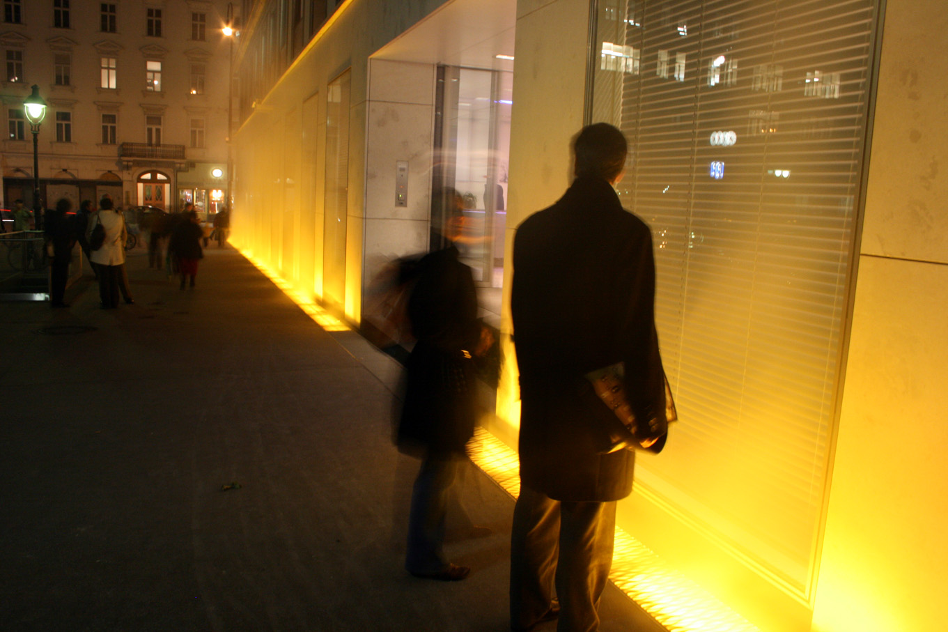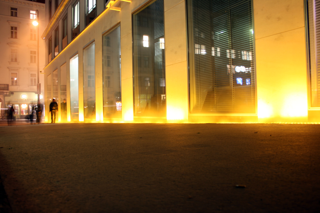 Heute endlich konnte ich mich dem Erlebnis Yellow Fog – der Installation von Olafur Eliasson – mitten in Wien hingeben. Nach langer Zeit des Wartens begannen die gelben Lampen unter dem Boden endlich aufzublitzen, dann ein paar Momente später der erste Ausstoß von Nebelschwaden. Endlich mitten im Nebel, endlich live dabei. Nach anfänglicher Euphorie und etlichen Fotos steigt ein Gefühl von leichter Enttäuschung in mir hoch. Das gelbe Licht gibt eine nette Stimmung und der Dunst an der Fassade des Verbundgebäudes verstärkt das Erlebnis, aber von der erwarteten Genialität verspüre ich dann schlussendlich doch nichts.